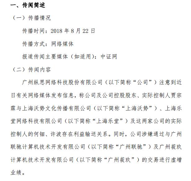 公告顯示,廣州縱思網(wǎng)絡(luò)科技股份有限公司(以下簡(jiǎn)稱“公司”)注意到近日有關(guān)網(wǎng)絡(luò)媒體發(fā)布信息,稱公司及公司控股股東、實(shí)際控制人賈宗霖與上海沃勢(shì)文化傳播有限公司(以下簡(jiǎn)稱“上海沃勢(shì)”)、上海樂堂網(wǎng)絡(luò)科技有限公司(以下簡(jiǎn)稱“上海樂堂”)及這兩家公司的實(shí)際 控制人的何鈿、許波存在利益輸送關(guān)系。同時(shí),公司涉嫌通過與廣州 聯(lián)馳計(jì)算機(jī)技術(shù)開發(fā)有限公司(以下簡(jiǎn)稱“廣州聯(lián)馳”)及廣州莜玖計(jì)算機(jī)技術(shù)開發(fā)有限公司(以下簡(jiǎn)稱“廣州莜玖”)的交易進(jìn)行虛增業(yè)績(jī)。