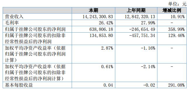 報告期實現(xiàn)營業(yè)收入14,243,300.83元,較上期上升10.91%;報告期實現(xiàn)利潤總額663,650.50元,較上期上升443.99%,凈利潤638,806.18元,較上期上升358.99%。