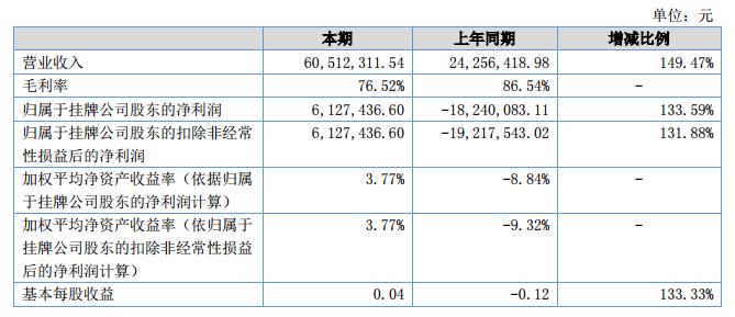 報(bào)告期內(nèi),公司營(yíng)業(yè)收入為60,512,311.54元,相對(duì)于去年同期上升149.47%;營(yíng)業(yè)成本為14,210,615.87元,較上年度上升335.28%;凈利潤(rùn)為6,127,436.60元,較上年度上升133.59%。?