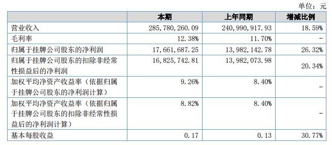 報(bào)告期內(nèi)公司完成營(yíng)業(yè)收入285,780,260.09元,比上年同期增長(zhǎng)了18.59%,實(shí)現(xiàn)凈利潤(rùn)17,661,687.25元,較上年同期增長(zhǎng)26.32%。?