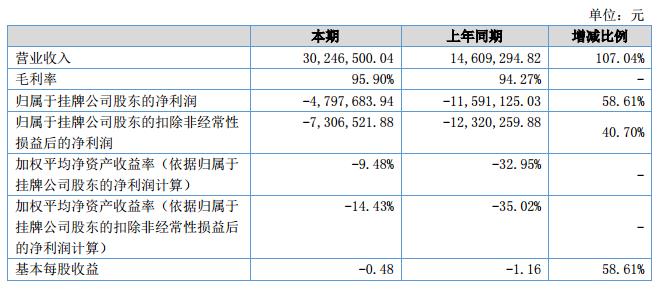 報告期內(nèi),公司實現(xiàn)營業(yè)收入3,024.65萬元,較去年同期增加1,563.72萬元,同比增長107.04%;公司利潤總額和凈利潤分別為-554.85萬元、-479.77萬元,同比增長59.07%、58.61%。?