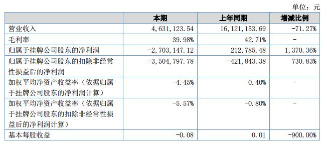報告期內(nèi)實現(xiàn)營業(yè)總收入4,631,123.54元,比上年同期減少71.27%,凈利潤為-2,731,732.03元,比上年同期減少1432.19%。截至報告期末,公司資產(chǎn)總額63,722,555.78元,比上年同期減少3.76%;負債總額8,587,601.05元,比上年同期減少36.81%;凈資產(chǎn)55,134,954.73元,比上年同期上升4.51%。歸屬母公司凈利潤-2,703,147.12元,每股收益-0.08元,較上年同期每股收益下降900.00%。?