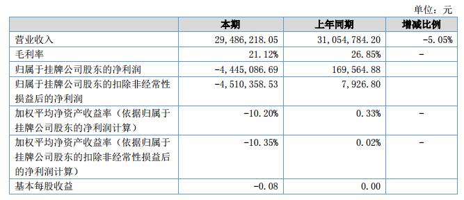 報(bào)告期內(nèi),公司實(shí)現(xiàn)營(yíng)業(yè)收入2,948.62萬(wàn)元,較上年同期的3,105.48萬(wàn)元減少了156.86萬(wàn)元,減幅5.05%;本期產(chǎn)品毛利率21.12%,與上年同期的26.85%減少了5.73%;本期實(shí)現(xiàn)凈利潤(rùn)-444.51萬(wàn)元。?