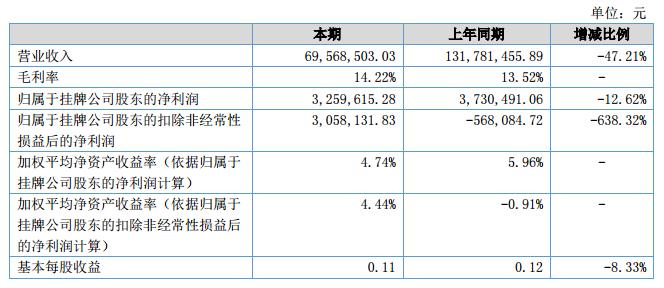 報告期內(nèi)實現(xiàn)營業(yè)收入6,956.85萬元,實現(xiàn)凈利潤325.96萬元。報告期綜合毛利率為14.22%,較上年同期略有上升。報告期內(nèi)公司總資產(chǎn)為19,654.11萬元,同比下降8.47%,凈資產(chǎn)7,043.63萬元,同比增加4.85%。?