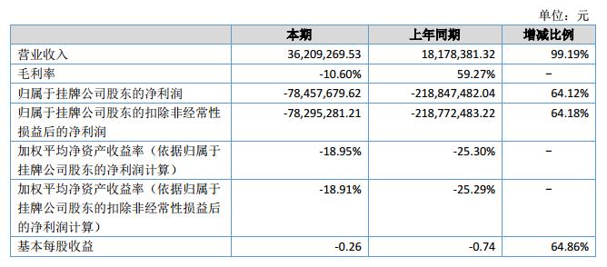 報(bào)告期內(nèi),公司實(shí)現(xiàn)營(yíng)業(yè)收入36,209,269.53元,同比增長(zhǎng)99.19%,公司營(yíng)業(yè)成本為40,078,411.64元,同比增長(zhǎng)441.33%;公司經(jīng)營(yíng)活動(dòng)產(chǎn)生的現(xiàn)金流量?jī)纛~為-47,210,624.48元,同比增加67.10%;公司歸屬于掛牌公司股東的凈利潤(rùn)為-78,524,463.10元,同比減少虧損64.12%。?