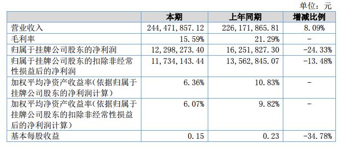 報告期內(nèi),公司實現(xiàn)營業(yè)收入244,471,857.12元,與上年同期相比增長8.09%;營業(yè)成本206,352,916.78元,與上年同期相比增長15.92%;實現(xiàn)凈利潤15,172,501.87元,與上年同期相比下降22.67%。?