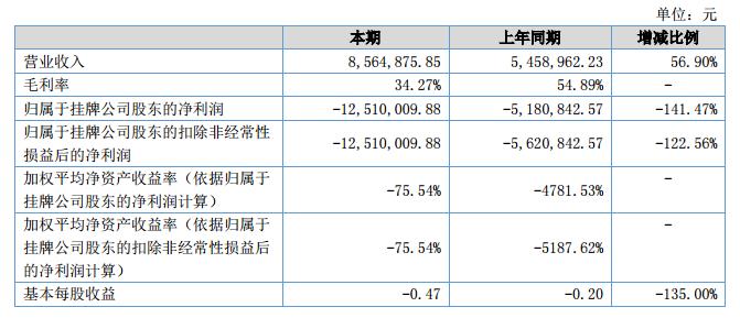 報告期內(nèi)公司實現(xiàn)收入8,564,875.85元,較2017年同期增長56.90%;凈利潤為-12,510,009.88元,較2017年同期虧損增加141.47%。?