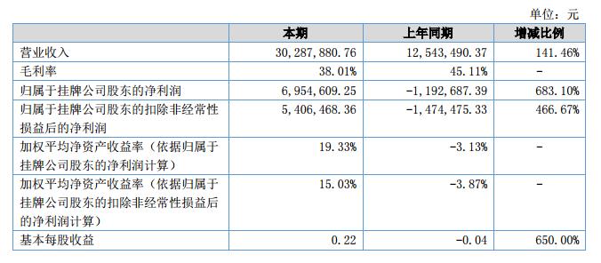 報告期公司營業(yè)收入為3,028.79萬元,較上年同期增長141.46%;報告期營業(yè)總成本2,377.79萬元,較上年同期1,388.65萬元增加989.14萬元;公司營業(yè)利潤為786.37萬元,較上年同期增長了1,015.40%;報告期內(nèi)公司經(jīng)營活動產(chǎn)生的現(xiàn)金流量凈額為-173.97萬元?。