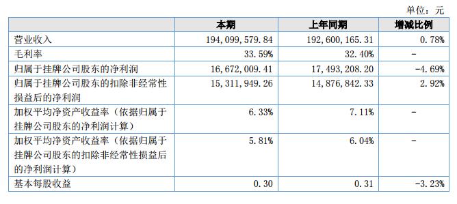 報(bào)告期內(nèi),公司實(shí)現(xiàn)營(yíng)業(yè)收入194,099,579.84元,比上年同期增加0.78%;報(bào)告期內(nèi),公司實(shí)現(xiàn)歸屬于掛牌公司股東扣非后的凈利潤(rùn)15,311,949.26元,比上年同期增加2.92%。?