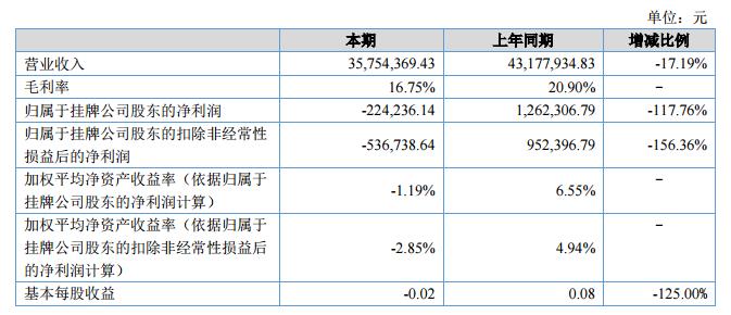 報(bào)告期內(nèi),公司營業(yè)收入35,754,369.43元,比上年同期為43,177,934.83元同比減少17.19%,主要是因?yàn)槭苄袠I(yè)去產(chǎn)能政策和國家環(huán)保督察影響,公司產(chǎn)品生產(chǎn)供貨嚴(yán)重不足,從而使收入有所下滑。報(bào)告期內(nèi)凈利潤為-224,236.14元,上年同期為1,262,306.79元同比減少117.76%,主要原因是報(bào)告期內(nèi)銷售收入下降,毛利率下降,造成凈利潤同比下降。?