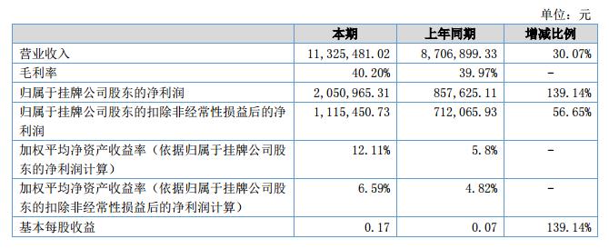 報(bào)告期內(nèi)公司的營(yíng)業(yè)收入11,325,481.02元,比上年同期增加2,618,581.69元,相比于上年同期增加30.07%;公司的凈利潤(rùn)2,051,019.51元,比上年同期增加1,193,394.40元,相比于上年同期增加139.15%。?