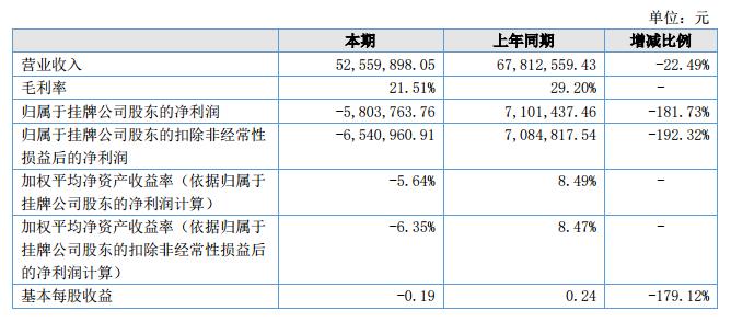 報(bào)告期內(nèi),公司實(shí)現(xiàn)營(yíng)業(yè)收入5,255.99萬(wàn)元,較上年同期下降22.49%;實(shí)現(xiàn)凈利潤(rùn)-580.38萬(wàn)元,較上年同期下降181.73%。?