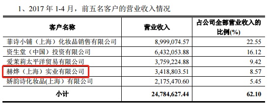2017年12月,知韜股份披露的公開轉讓說明書顯示,在2017年1月至4月,赫燁(上海)是公司的第四大客戶,為公司帶來342萬元營收,占公司當期營收的8.6%。