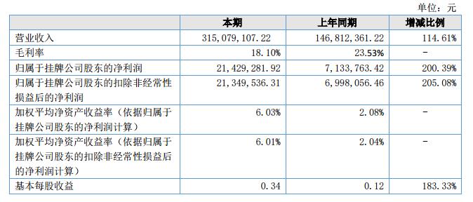 報告期內(nèi),公司實現(xiàn)銷售收入315,079,107.22元,比去年同期146,812,361.22元增長114.61%;報告期內(nèi)凈利潤21,429,281.92元,比上年同期7,133,763.42元增加14,295,518.50元,增長200.39%。?
