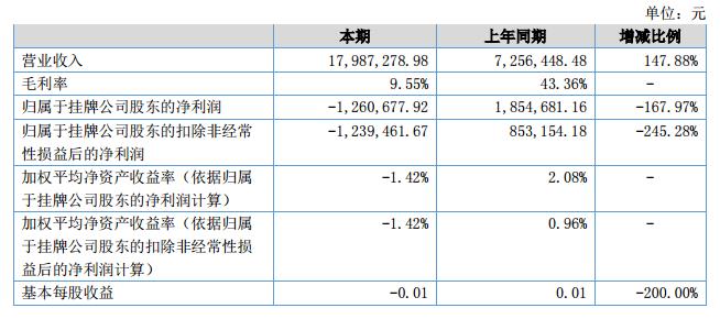 報告期內(nèi),公司實現(xiàn)營業(yè)收入17,987,278.98元,比去年同期7,256,448.48元增長147.88%;公司凈利潤為-1,260,677.92元,扣除非經(jīng)常性損益的凈利潤-1,239,461.67元,相比去年同期由盈轉(zhuǎn)虧。?