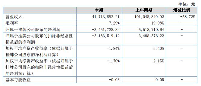 報(bào)告期內(nèi)公司實(shí)現(xiàn)營(yíng)業(yè)收入41,713,892.21元,同比下降58.72%,歸屬于股東的凈利潤(rùn)為-3,451,728.32元,同比下降162.55%。?