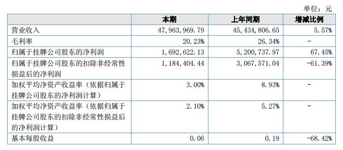 報告期內(nèi),公司營業(yè)收入為4,796.40萬元,較上年同期增加5.57%。公司的歸屬于掛牌公司股東的凈利潤為169.26萬元,較上年同期減少了67.45%,主要原因是外匯匯率的不利變動,以及去年同期新三板掛牌的政府一次性補助210萬元,占去年同期凈利潤比重較大。公司的營業(yè)總成本為4,840.57元,較上年同期增加14.28%,毛利率為20.23%,較上年下降了6.11%,主要源于報告期內(nèi)的外匯匯率一直比較低。?