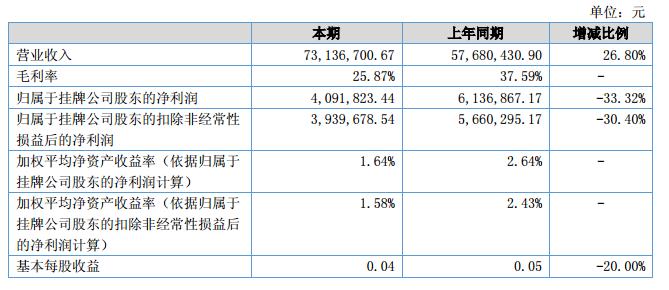 報告期內,公司實現(xiàn)營業(yè)收入7,313.67萬元,與去年同期同比增長26.80%;營業(yè)成本5421.64萬元,較上年同期增長50.61%;稅金及附加72.03萬元,上年為-52.33萬元;公司實現(xiàn)凈利潤409.18萬元,同比減少33.32%。
