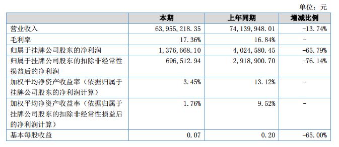 報告期內(nèi),公司經(jīng)營實現(xiàn)營業(yè)收入63,955,218.35元,同比下降13.74%;歸屬于掛牌公司股東的凈利潤為1,376,668.10元,同比下降了65.79%;總資產(chǎn)84,251,578.35元,比期初減少了3.46%。?