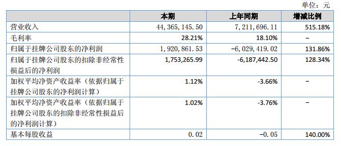報(bào)告期內(nèi)公司實(shí)現(xiàn)收入4,436.51萬(wàn)元,較去年同期增加了3,715.34萬(wàn)元,增幅515.18%;毛利率28.21%,去年同期毛利率18.10%;實(shí)現(xiàn)凈利潤(rùn)192.09萬(wàn)元,較去年同期增加755.80萬(wàn)元,增幅134.08%。