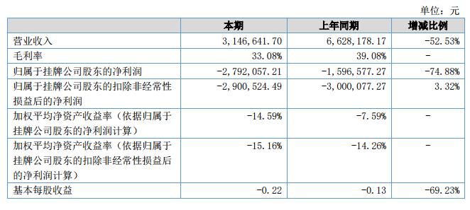 報告期內(nèi)公司營業(yè)收入3,146,641.70元,較上年同期減少52.53%;公司實現(xiàn)凈利潤-2,792,057.21元,較上年同期減少74.88%。?