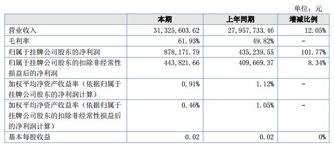 報(bào)告期內(nèi),公司實(shí)現(xiàn)營業(yè)收入31,325,603.62元,較上年同期增長3,367,870.16元,增長比率為12.05%;凈利潤為878,171.79元,較上年同期增加442,932.24元,較上年同期增長101.77%。?