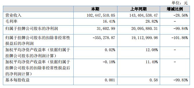 報告期內(nèi)公司實現(xiàn)營業(yè)收入1.02億元,較上年同期1.43億,同比下降28.56%;凈利潤3.16萬元,較上年同期2009.58萬元,同比下降99.84%。