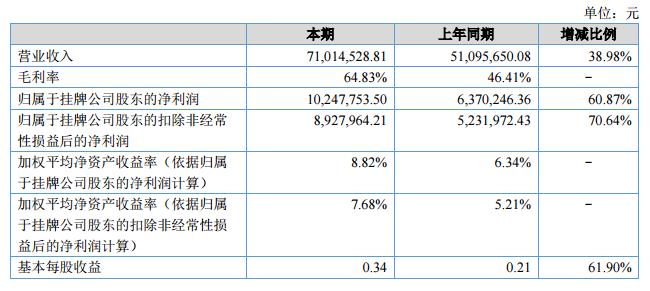 報(bào)告期內(nèi),公司實(shí)現(xiàn)營(yíng)業(yè)收入7,101.45萬元,較之上年同期的5,109.57萬元,同期增長(zhǎng)38.98%;銷售毛利率為64.83%,較上年同期增長(zhǎng)18.42個(gè)百分點(diǎn);公司實(shí)現(xiàn)凈利潤(rùn)1,024.78萬元,較上年同期增加60.87%,收入和凈利的增長(zhǎng)主要原因是公司加大研發(fā)投入,開發(fā)新產(chǎn)品帶來高毛利產(chǎn)品銷售擴(kuò)大占比上升,從而帶來營(yíng)業(yè)收入大幅上升,同時(shí)產(chǎn)能擴(kuò)大導(dǎo)致產(chǎn)品成本下降所致。?