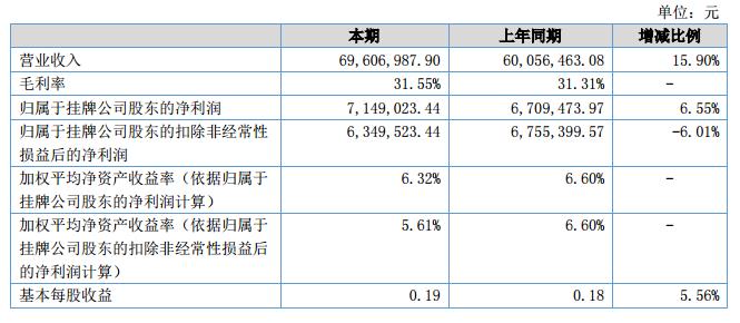 報告期內(nèi),公司實現(xiàn)營業(yè)收入69,606,987.90元,比去年同期增長15.9%,實現(xiàn)歸屬于掛牌公司股東的凈利潤7,149,023.44元。?