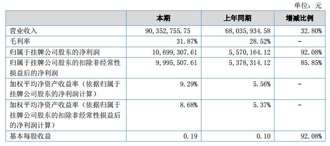 報告期內(nèi)公司實現(xiàn)營業(yè)收入9,035.27萬元,比去年同期增加2,231.68萬元,增長32.80%;2018年1-6月凈利潤1,069.93萬元,比去年同期增加512.91萬元,增長92.08%。總資產(chǎn)23,003.27萬元,比去年同期增加4,020.66萬元,增長25.02%;歸屬于掛牌公司凈資產(chǎn)為12,049.68萬元;比去年同期增加1750.40萬元,增長17.00%。?