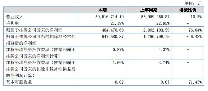 報(bào)告期內(nèi),公司實(shí)現(xiàn)營(yíng)業(yè)收入59,516,714.19元,較上年度同期增長(zhǎng)9.34%。凈利潤(rùn)484,470.69元,同比下降76.84%,主要原因在于2018年上半年有632,000.00元的對(duì)外捐贈(zèng),另外毛利率同比上年復(fù)同期下降了1.76%。?