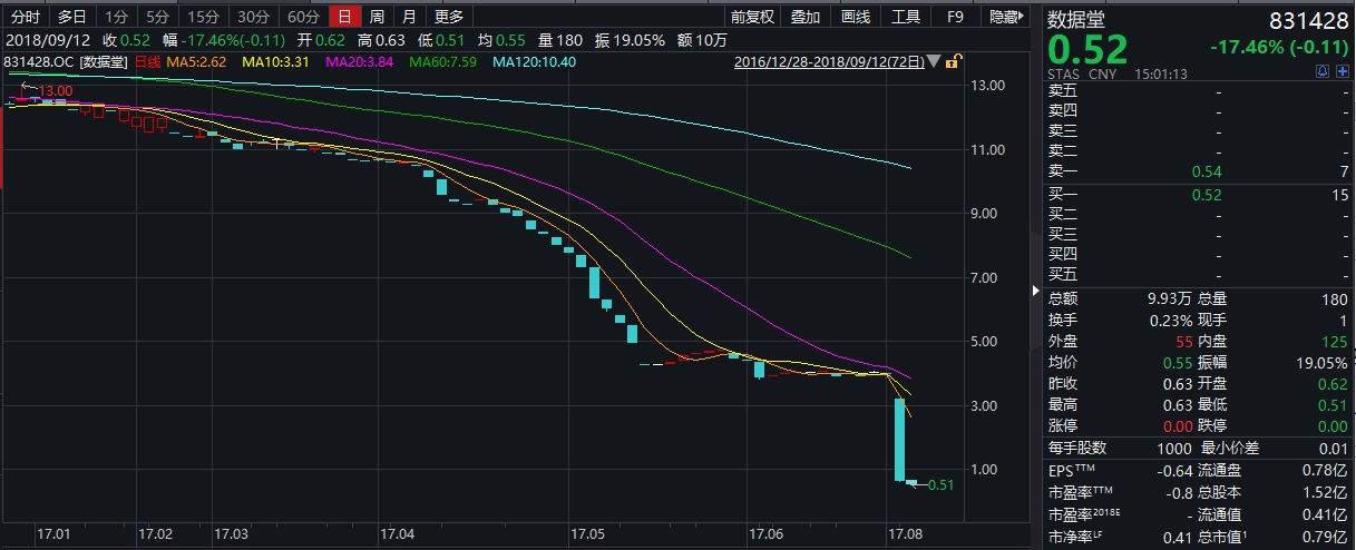 挖貝網(wǎng) 9月12日消息,新三板掛牌公司數(shù)據(jù)堂(831428)股票自2017年8月起停牌,歷時13個月,9月11日,股票恢復轉(zhuǎn)讓。在恢復轉(zhuǎn)讓的第一天,數(shù)據(jù)堂股票暴跌了84%,前期參與進來的投資者被套牢。