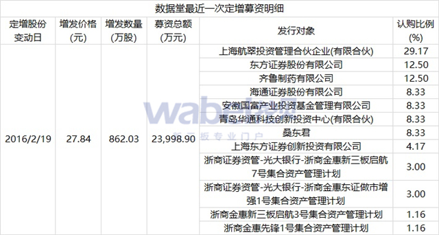 數(shù)據(jù)堂自2014年12月以來,共進行過3次定增募資,最近一次是在2016年2月。這次定增中,數(shù)據(jù)堂以27.84元/股的價格增發(fā)了862.03萬股,共募集資金2.4億元。投資者包括東方證券、海通證券在內(nèi)的6家機構(gòu)、5個投資基金及資管計劃和1個外部自然人。
