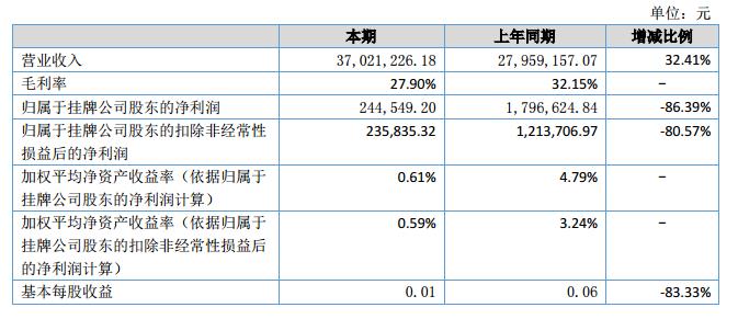 報(bào)告期內(nèi),實(shí)現(xiàn)營(yíng)業(yè)收入37,021,226.18元,較去年同期增長(zhǎng)32.41%;凈利潤(rùn)為234,659.20元,同比上年減少-86.71%。