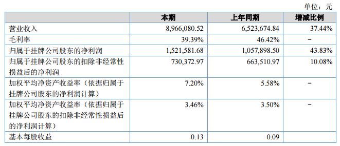 報(bào)告期內(nèi),公司實(shí)現(xiàn)營業(yè)收入8,966,080.52元,凈利潤1,521,581.68元。期末公司總資產(chǎn)為27,499,122.60元,凈資產(chǎn)為21,128,474.49元。?