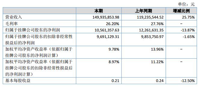 報(bào)告期內(nèi),公司實(shí)現(xiàn)營(yíng)業(yè)收入149,935,853.98元,較上年同期增加25.75%,主要原因是國(guó)外市場(chǎng)開(kāi)拓成效大業(yè)績(jī)上升;實(shí)現(xiàn)歸屬掛牌公司所有者凈利潤(rùn)10,561,357.63元;公司總資產(chǎn)228,185,226.03元,較上年同期增加0.45%;歸屬掛牌公司所有者權(quán)益86,744,296.01元,較上年同期減少15.54%;經(jīng)營(yíng)活動(dòng)產(chǎn)生的現(xiàn)金流量?jī)纛~-946,981.73元。?