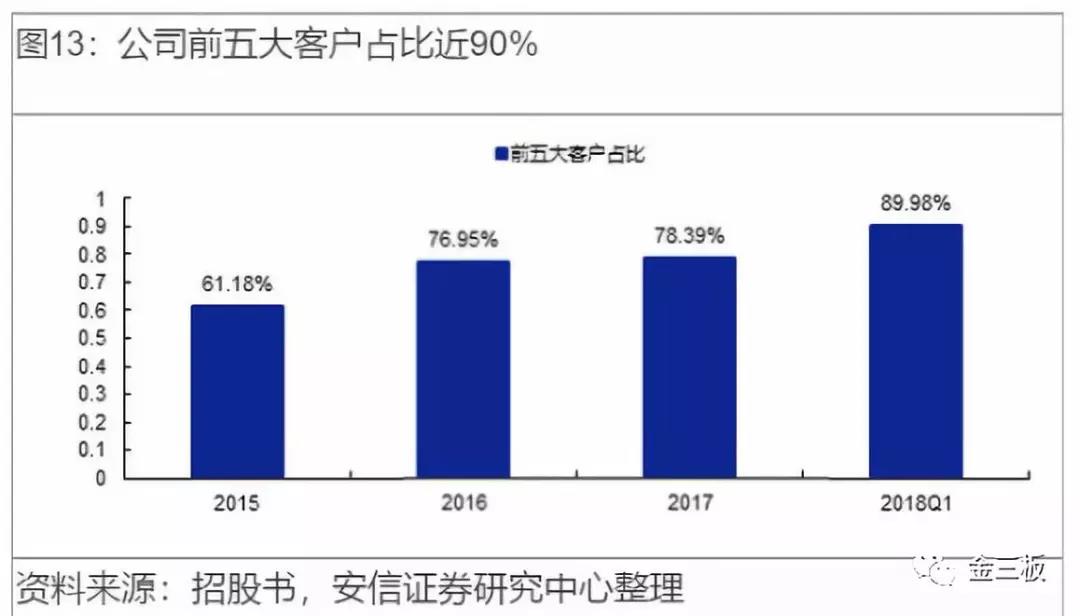 加上藍(lán)思科技,2015-2017年以及2018年一季度,公司向前五大客戶銷售占比分別為61.18%、 76.95%、78.39%及89.98%。
