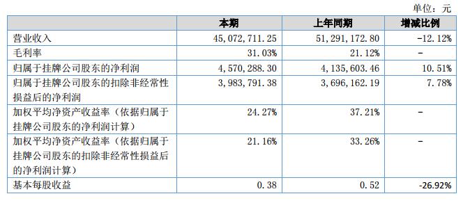 報(bào)告期公司營業(yè)收入4,507.27萬元,較上年同期下降621.85萬元,同比下降12.12%;資產(chǎn)總額4,383.86萬元,較上年同期增長1,154.88萬元,同比增長35.77%;凈資產(chǎn)2,109.59萬元,較上年同期增長791.35萬元,同比增長60.03%;凈利潤457.30萬元,較上年同期增長43.64萬元,較上年同期增長10.55%,毛利率31.03%,較上年同期增長46.99%。?
