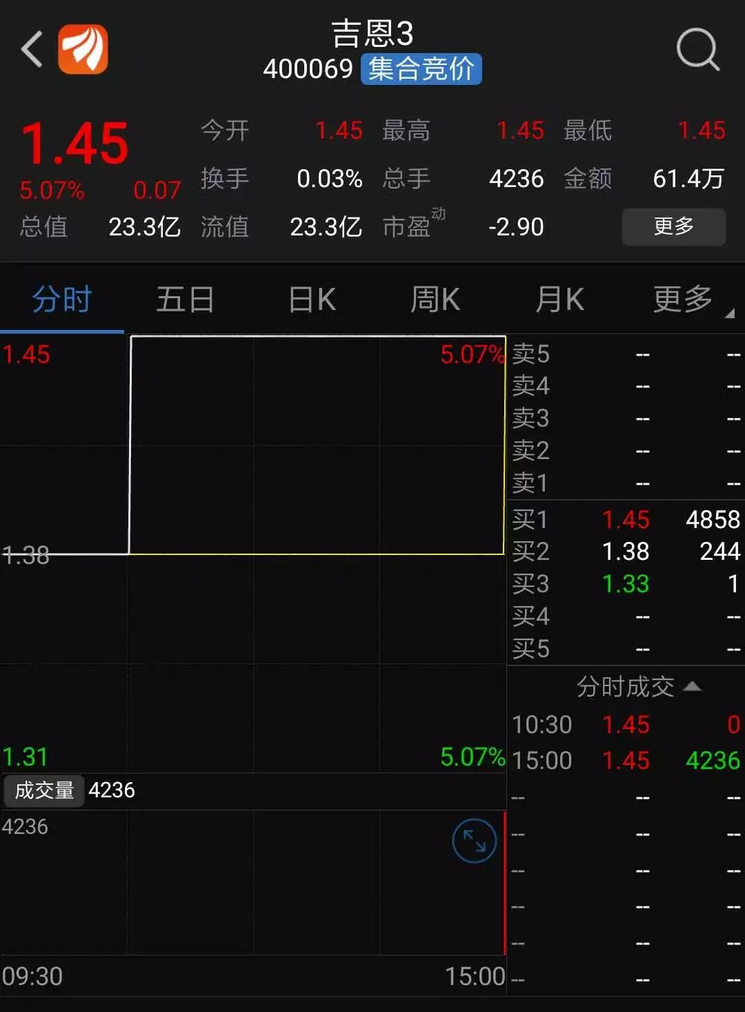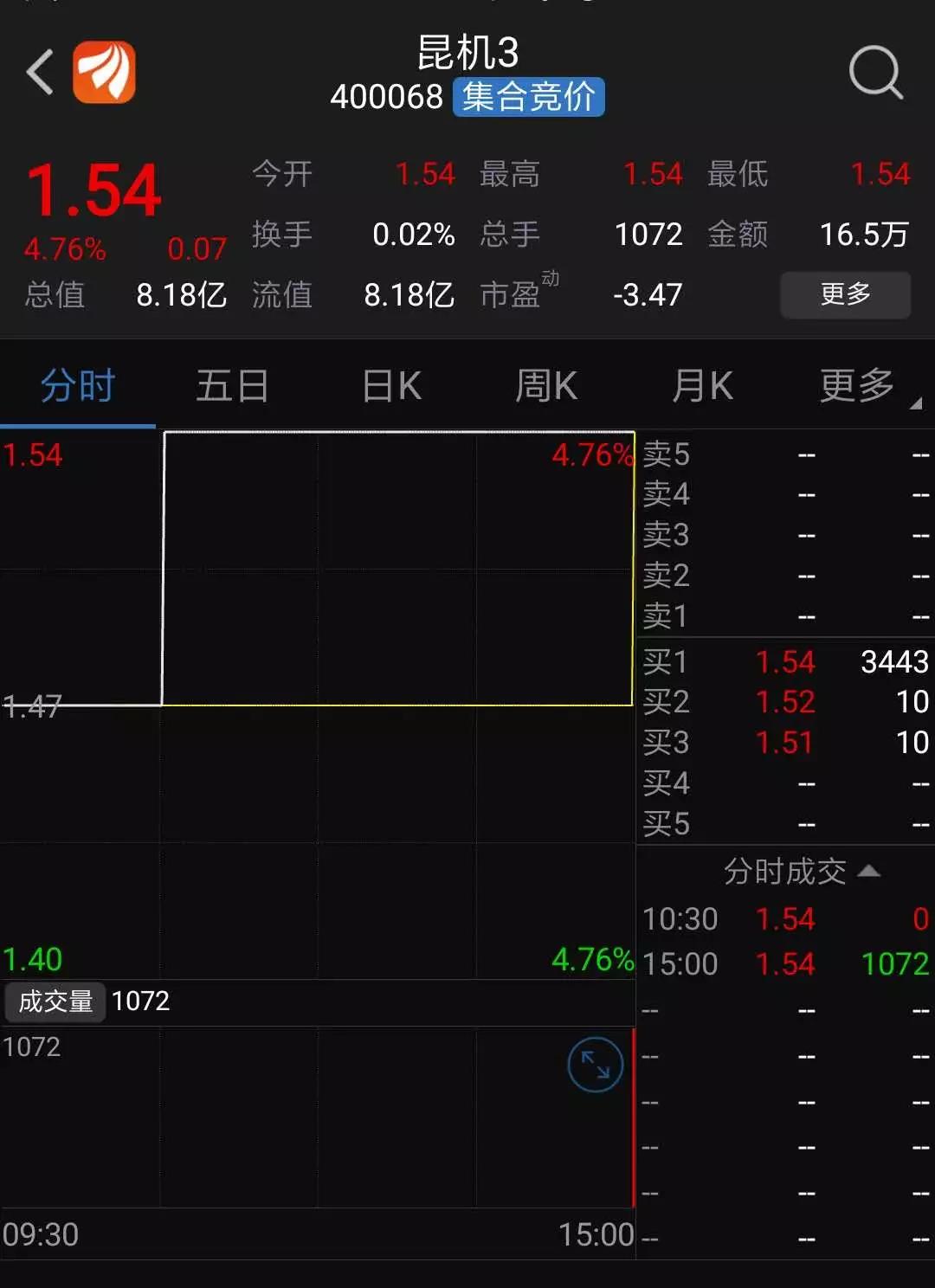 今天開盤后,上午10點30分首次揭示成交價格時,昆機3報價為1.54元/股,漲幅4.76%,達到漲停;吉恩3報價為1.45元/股,漲幅達5.07%,同為漲停。