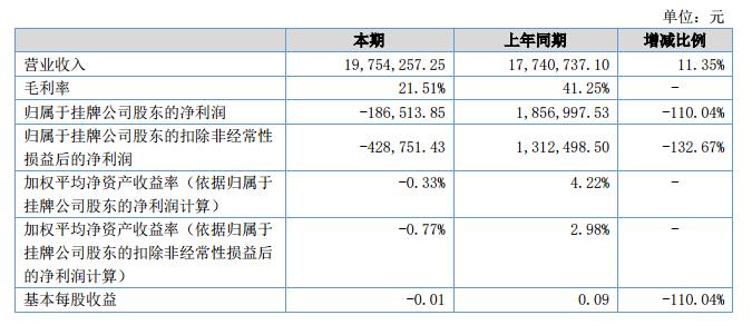 報告期內(nèi),公司整體財務(wù)狀況出現(xiàn)下滑,營業(yè)收入整體保持平穩(wěn),但凈利潤同比出現(xiàn)虧損,從而造成公司有關(guān)盈利指標(biāo)大幅下降。公司的營業(yè)收入19,754,257.25元,同比增長11.35%,主要原因是:公司加強(qiáng)自身產(chǎn)品銷售,強(qiáng)化營銷團(tuán)隊,提高產(chǎn)品交付能力,從而推動了收入增長;營業(yè)成本15,505,473.89元,同比增長48.75%,主要原因是:上半年原材料價格大幅上升,導(dǎo)致生產(chǎn)成本增加;凈利潤-186,513.85元,出現(xiàn)虧損,主要是公司生產(chǎn)成本增加導(dǎo)致凈利潤下降;經(jīng)營性現(xiàn)金流量凈額-9,756,297.34元,上年同期為-11,651,964.80元,主要是因為公司本期購置原材料投入的金額加大,但公司提高了有關(guān)存貨的周轉(zhuǎn)效率,穩(wěn)定了現(xiàn)金狀況。?