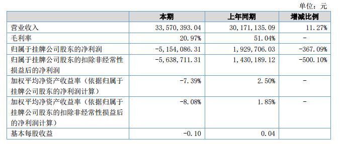 經(jīng)營成果:報告期內(nèi)公司實現(xiàn)銷售收入3357.04萬元,較去年同期增長11.27%,歸屬母公司股東的凈利潤-513.41萬元,較去年同期下降367.09%;公司總資產(chǎn)13037.61,較年初增加1.22%,歸屬母公司股東的凈資產(chǎn)689.54萬元,較年初增長10.57%。?