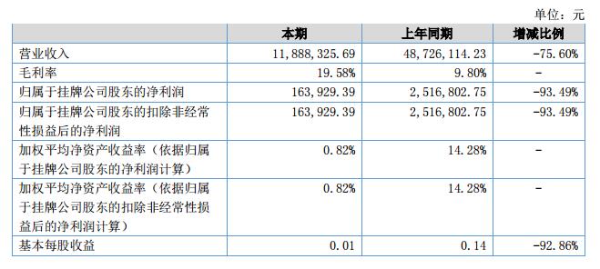 報(bào)告期內(nèi)實(shí)現(xiàn)營業(yè)收入11,888,325.69元,較上年同期下降75.60%;營業(yè)成本9,560,300.82元,較上年同期下降78.25%;實(shí)現(xiàn)凈利潤163,929.39元,較上年同期下降93.49%。