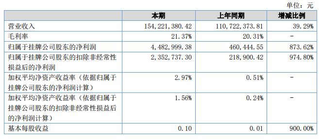 公司實(shí)現(xiàn)營(yíng)業(yè)收入154,221,380.42元,較上年同期增加39.29%;公司營(yíng)業(yè)成本121,256,986.22元,較上年同期增加37.43%;公司凈利潤(rùn)4,482,999.38元,較上年同期增加873.62%。?