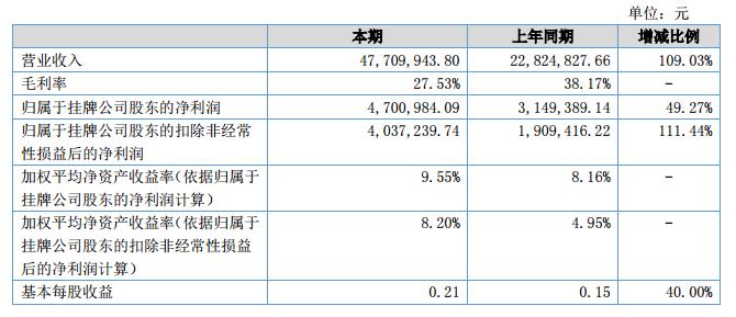 報(bào)告期公司實(shí)現(xiàn)營(yíng)業(yè)收入4,770.99萬(wàn)元,較上年同期增長(zhǎng)109.03%;實(shí)現(xiàn)歸屬于掛牌公司股東的凈利潤(rùn)為470.10萬(wàn)元,較上年同期增長(zhǎng)49.27?%。