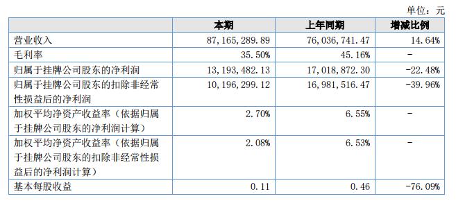 報告期內(nèi)公司實(shí)現(xiàn)營業(yè)收入8,716.53萬元,較上年同期增加了1,112.85萬元,增長比例14.64%;實(shí)現(xiàn)凈利潤13,282,314.74元,較上年同期下降3,736,557,56元,同比下降。?