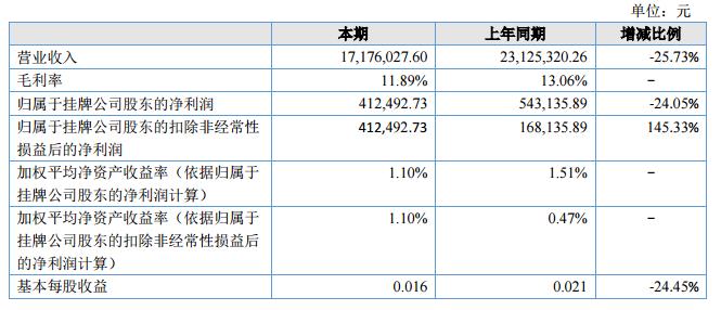 報(bào)告期內(nèi)公司實(shí)現(xiàn)營業(yè)收入17.176.027.60元,比去年同期減少25.73%,歸屬母公司凈利潤412,492.73元,同比減少24.05%,受中美貿(mào)易戰(zhàn)影響,今年公司訂單較往年減少,因此上半年盈利低于往年,下半年利潤增長也不容樂觀。?