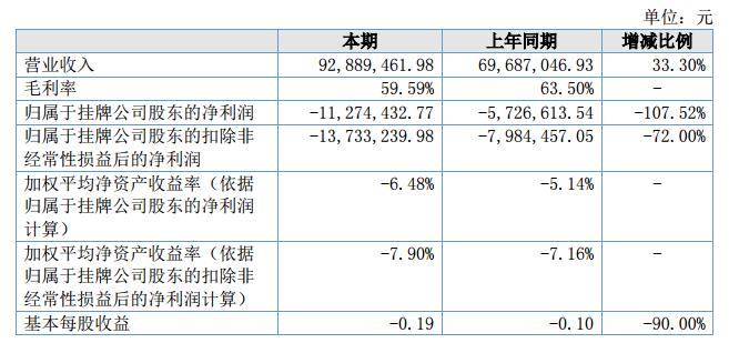 報告期內(nèi)公司實現(xiàn)營業(yè)收入92,889,461.98元,較上年同期增長33.30%;公司營業(yè)收入以軟件銷售類收入為主,報告期各期均在55%-60%之間;軟件服務(wù)類收入占比穩(wěn)定在20%-30%之間;凈利潤-12,246,233.61元,歸屬于掛牌公司股東-11,274,432.77元,經(jīng)營活動產(chǎn)生的現(xiàn)金凈額為-39,733,015.55元。?