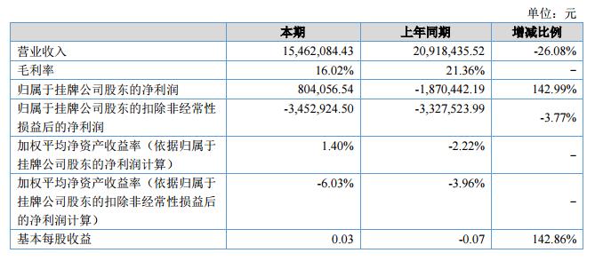 報(bào)告期實(shí)現(xiàn)銷售收入完成 15,462,084.43 元,比去年同期下降 26.08%;凈利潤(rùn) 804,056.54 元, 比去年同期增長(zhǎng) 142.99%。