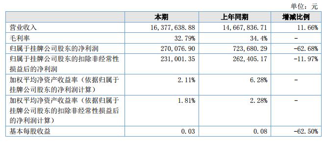 報告期內(nèi)實現(xiàn)銷售收入1,637.76萬元,較去年同期增長11.66%,增長原因為公司上一年度所積累開發(fā)的新客戶訂單穩(wěn)步增長所致;報告期毛利率為32.79%,比去年同期下降4.68個百分點,主要是除油清洗劑毛利比去年同期下降11.64%以及公司采購原材料為石油衍生品,平均采購價格對比上年度增長10%所致;報告期內(nèi)實現(xiàn)凈利潤27萬元,比去年同期下降了62.68%,主要原因為公司上一年度處置固定資產(chǎn)收益53萬元所致。?