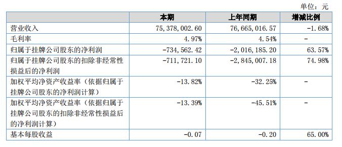 報告期內(nèi),公司實現(xiàn)營業(yè)收入75,378,002.60元,較上年同期下降-1.68%;營業(yè)成本71,628,350.87元,較上年同期下降-2.12%。主要原因:公司業(yè)務(wù)保持跟上年同期一致。報告期內(nèi)營業(yè)成本變動趨勢與收入變動趨勢一致。報告期內(nèi),公司毛利率為4.97%,較上年同期提高了0.43個百分點。主要原因:報告期內(nèi),隨著公司與供應(yīng)商的合作程度不斷加深,且付款逐漸采用預(yù)付方式,使得采購價同比上年同期有所下降,但同期銷售價格與去年同期基本持平,造成公司銷售毛利率上升。報告期內(nèi),公司實現(xiàn)凈利潤-734,562.42元,較上年同期上升63.57%,其中扣除非經(jīng)常性損益后歸的凈利潤為-711,721.10元,較上年同期上升74.98%。?